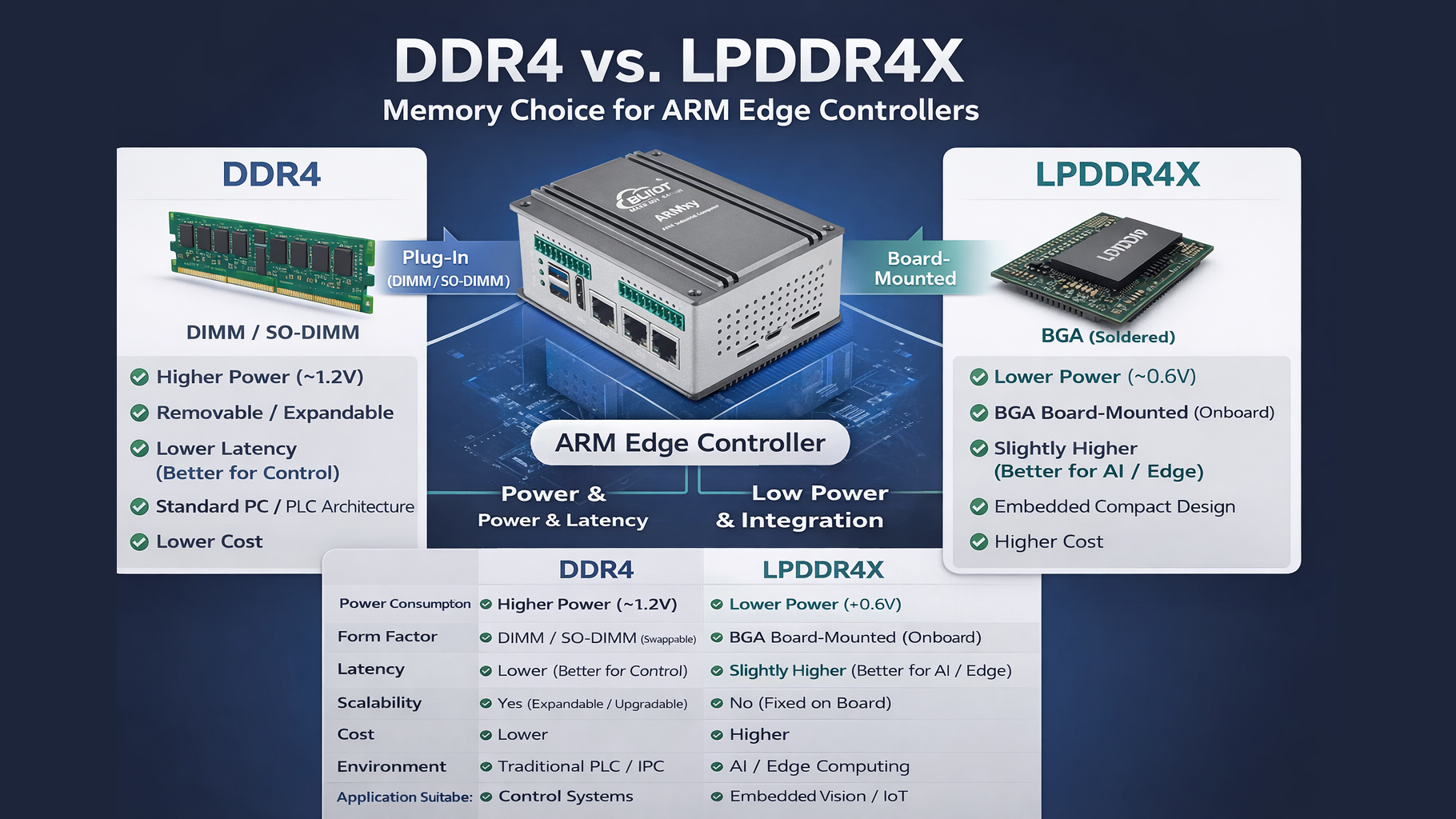 In today’s rapidly developing landscape of industrial automation and edge computing, memory is no longer just about capacity — it directly impacts system power consumption, performance, stability, and overall product design. Among various memory solutions, DDR4 and LPDDR4X have become the two most mainstream options for ARM-based embedded controllers.